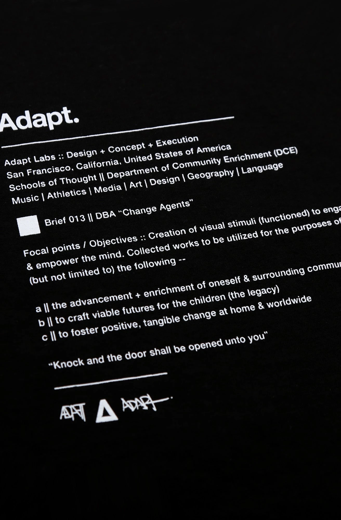 Change Agents. Featuring our premium A1 tee, a softer and slightly more fitted product. Unless you are between sizes, we recommend ordering the same size Adapt tee you would normally wear. 100% combed cotton.